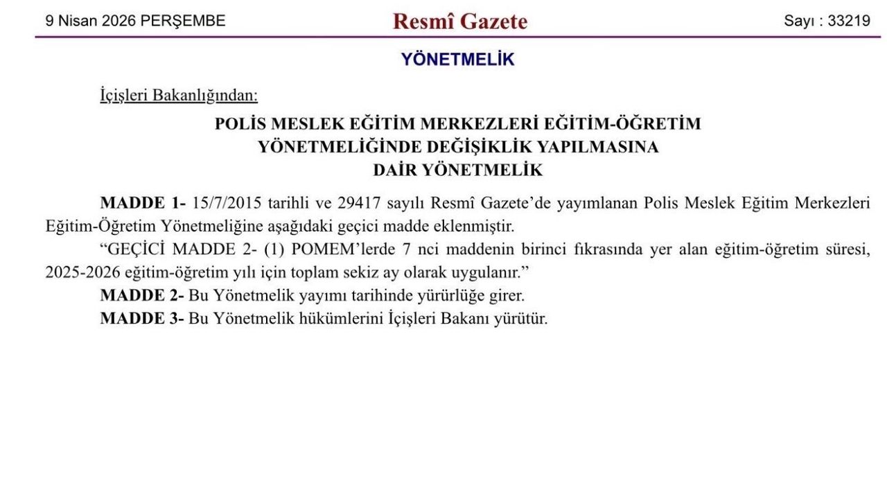 Polis Meslek Eğitim Merkezleri’nde ise aynı eğitim yılı için süre toplam 8 ay olarak belirlendi. Böylece POMEM öğrencileri için de mevcut eğitim takvimi kısaltılmış oldu. Yapılan düzenlemenin 9 Nisan 2026 tarihli Resmî Gazete’de yayımlanarak yürürlüğe girdiği bildirildi.